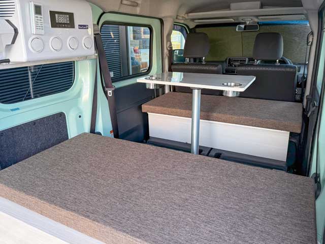 ランチタイムにエンジンをかけずに、バッテリーで動くクーラーで環境に優しい昼休みを送ったり、工事現場の休憩時間にクーラーをつけて休憩を取ったり、子供の部活のお迎えの待ち時間にエンジンを切って、環境に、地球に優しいSDG’sを実践しませんか?カフェラテ2は対座シートを採用し、2人までの就寝が可能になりました。